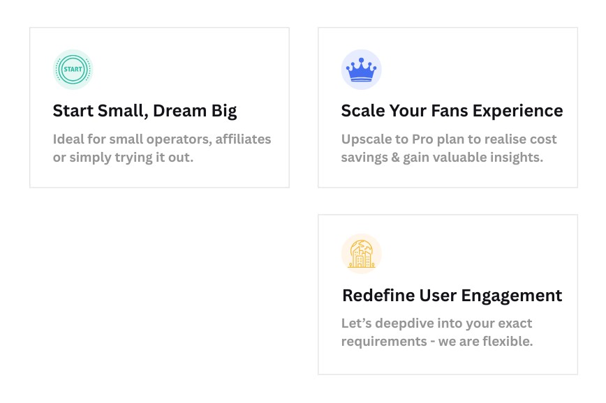 Starter for local apps, Pro for regional platforms, or Enterprise for global reach. Start amplifying your punter's sports experience.